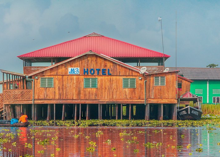 Hôtel original sur pilotis avec vue panoramique, décor bucolique et restaurant, parfait pour séjourner à Ganvié.